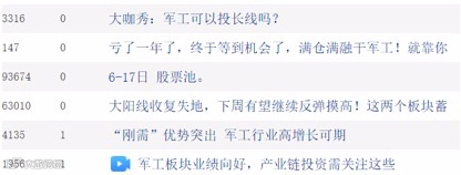 久违的强势行情激发了投资者对军工板块的讨论热情。梳理发现,股吧中,近几日,股民对军工板块的看多言论明显增多,一些股民强调“方向对了很重要”,还有一些被军工股深套的股民激动地喊出“亏了一年了,终于等到机会了,满仓干军工”的口号。