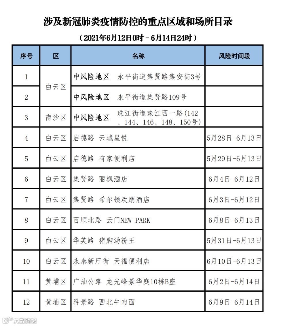 6月15日晚,广州市卫健委发布《关于2021年6月12日-14日期间新冠病毒感染者涉及的重点区域和场所的通报》,请提及的风险时间段到过相关重点区域和场所的人员,立即与居住地就近的街道(社区)工作人员联系,并携共同居住人员前往就近的核酸检测点免费进行核酸检测,同时积极配合做好流行病学调查工作。