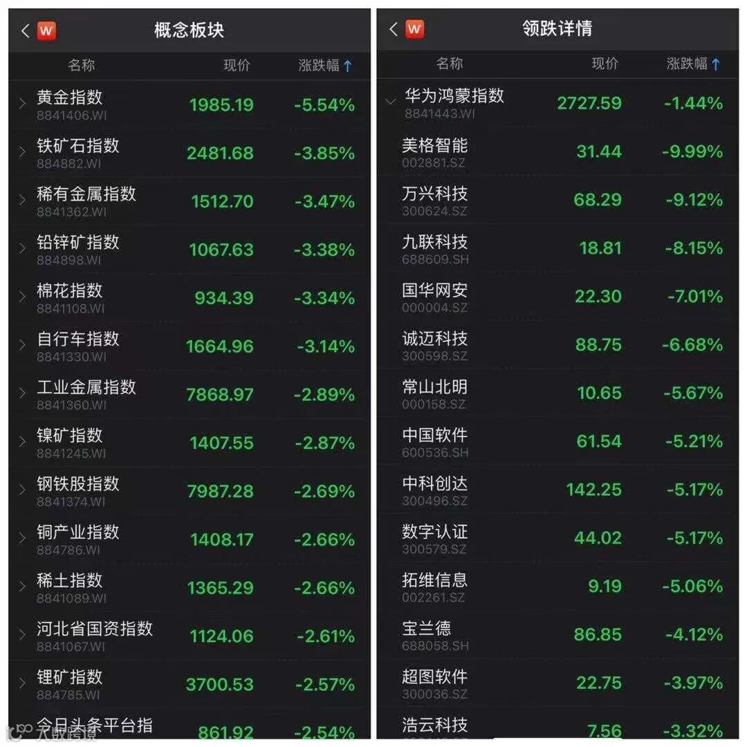 从概念板块情况来看,黄金、铁矿石、稀有金属等概念板块跌幅居前,多为有色金属板块相关的概念板块。