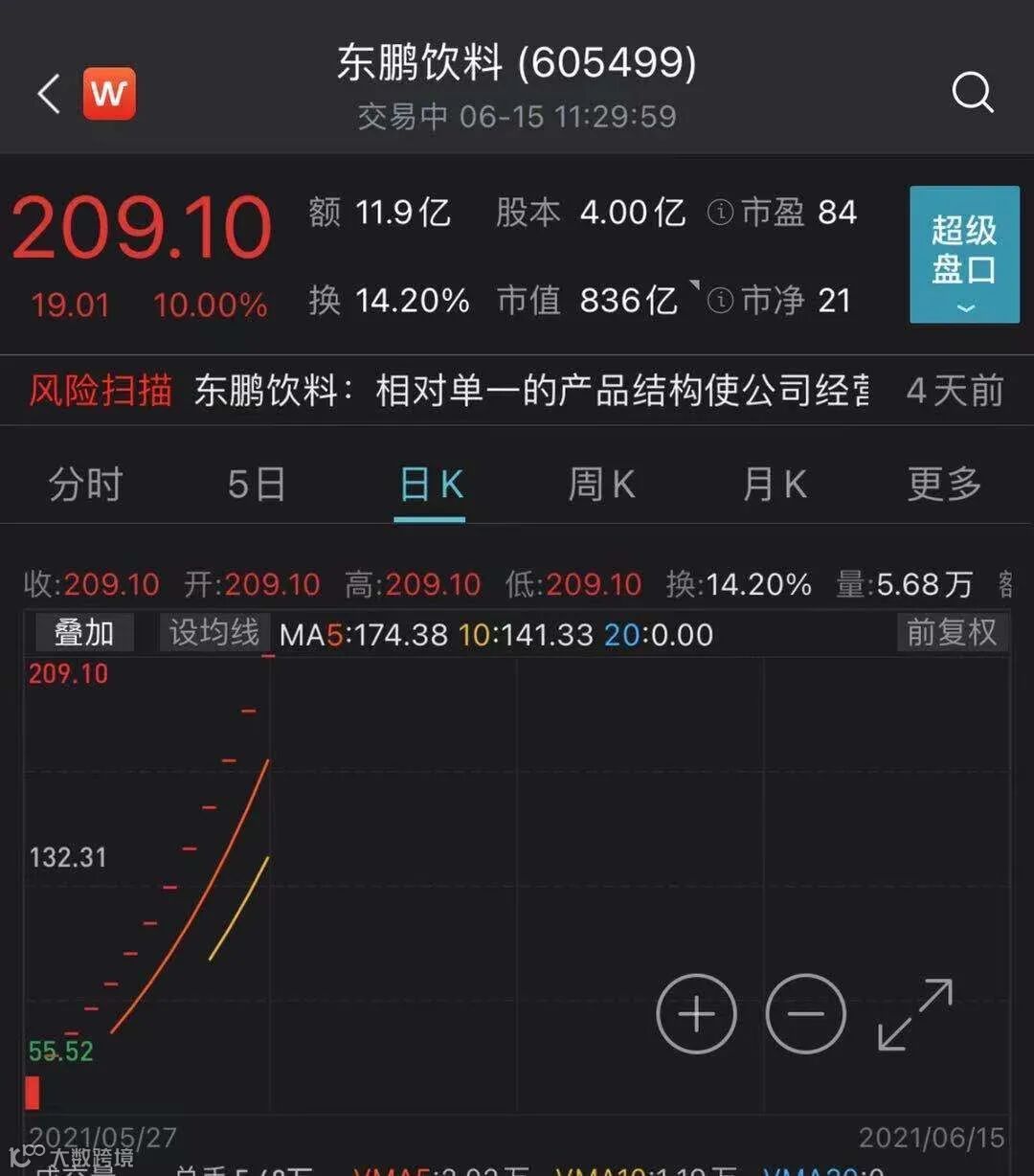 截至午间收盘,东鹏饮料股价为209.10元/股,涨停板上的封单为21.2万手,成交额为11.9亿元,总市值达836亿元。东鹏饮料发行价为46.27元/股,作为沪市主板新股,东鹏饮料一签为1000股,假如中新股至今未卖的话,一签浮盈达16.28万元。