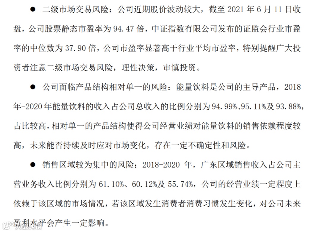 东鹏饮料还提及了公司面临产品结构相对单一、销售区域较为集中、市场竞争加剧、新产品推广不及预期的风险。
