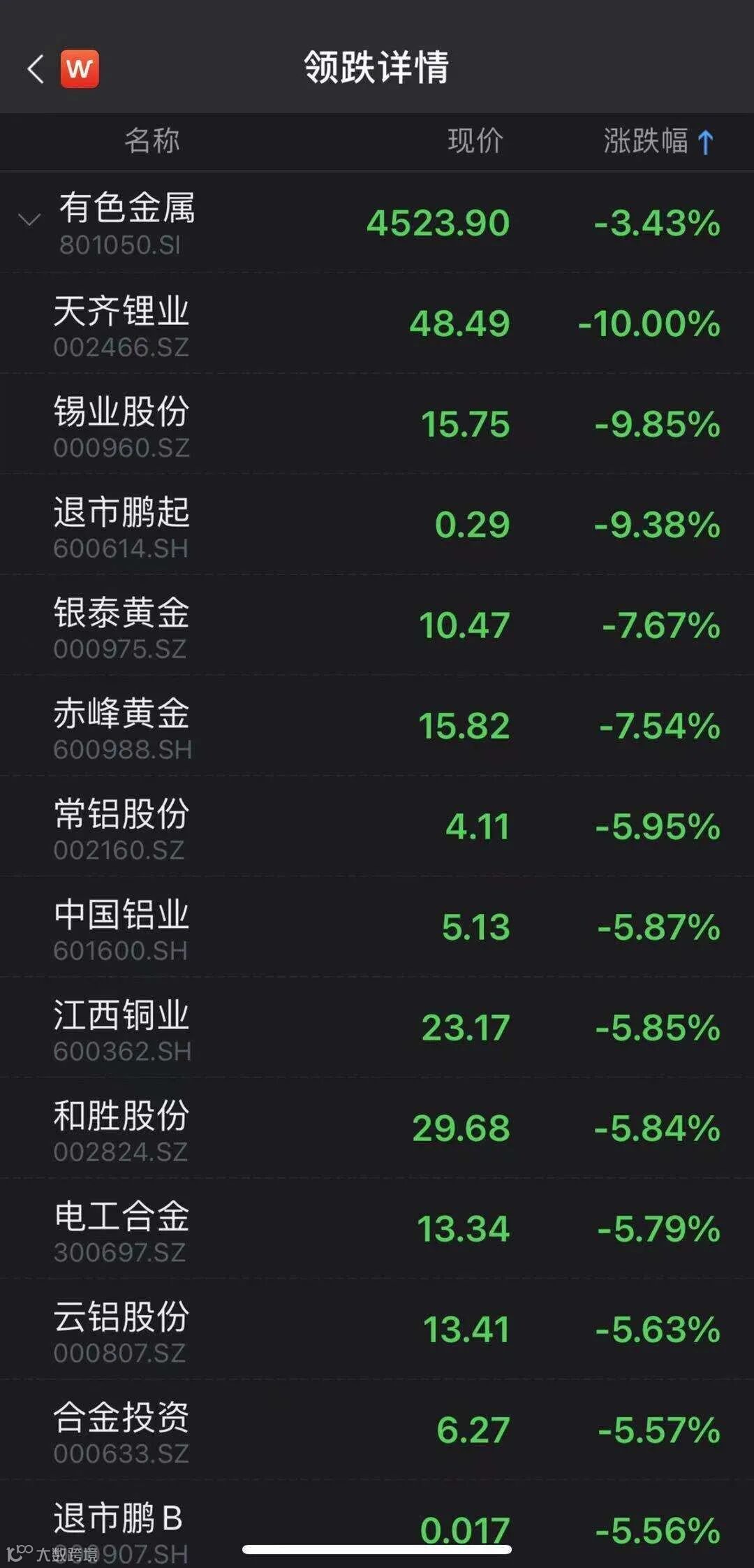 在有色金属板块中,天齐锂业跌停,锡业股份跌逾9%,银泰黄金、赤峰黄金跌逾7%。