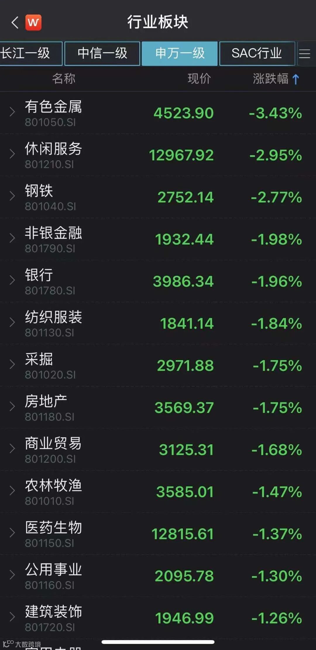 从行业情况来看,申万一级28个行业中,仅有电子、汽车、国防军工行业上涨,分别上涨0.99%、0.80%、0.71%;有色金属、休闲服务、钢铁行业跌幅居前,分别下跌3.43%、2.95%、2.77%。