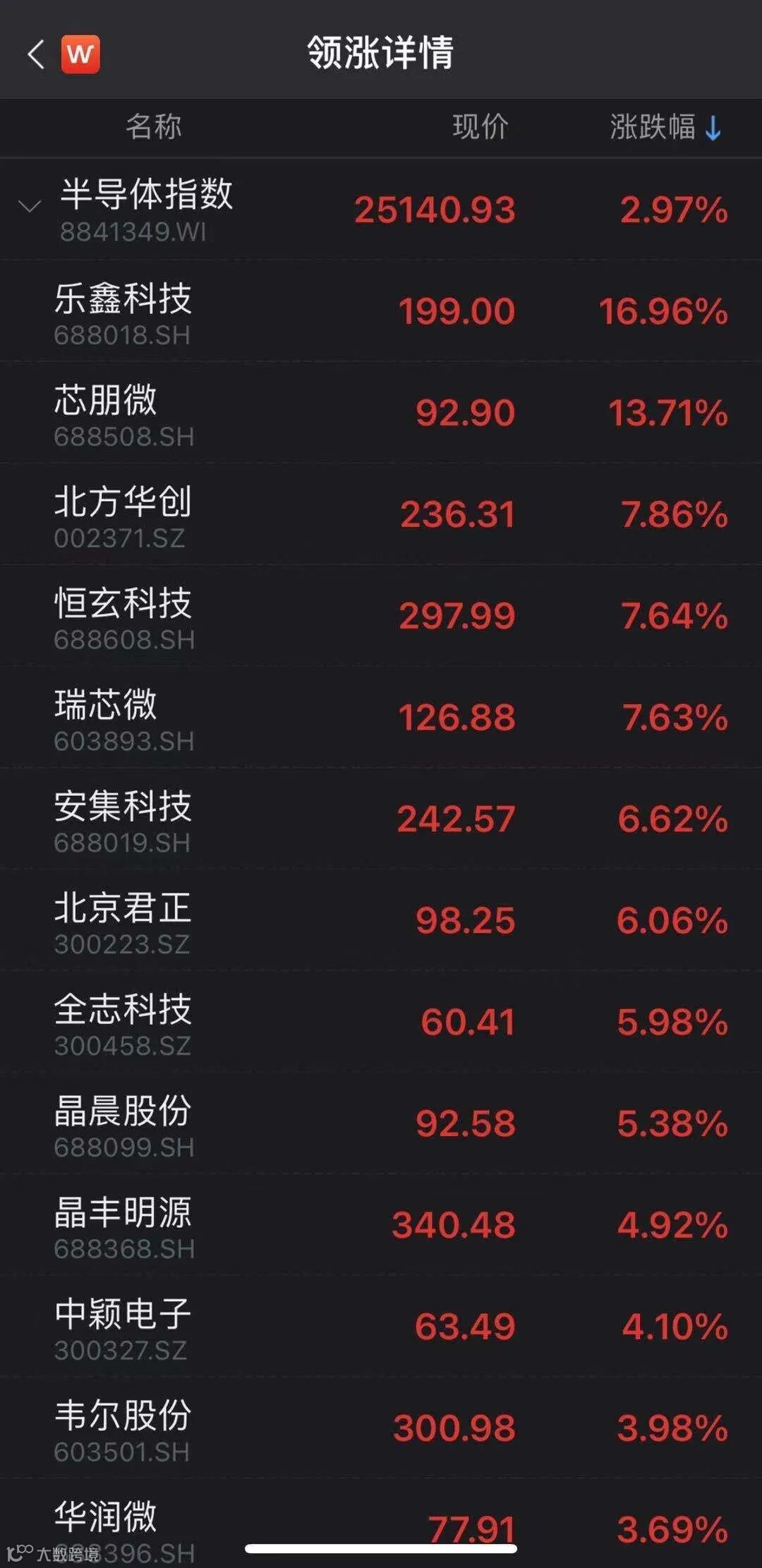 今天上午的市场中,半导体板块表现活跃,Wind半导体指数上涨2.97%。板块内乐鑫科技涨逾16%,芯朋微涨逾13%,北方华创、恒玄科技、瑞芯微涨逾7%,安集科技、北京君正涨逾6%。其中,北方华创盘中股价创历史新高。
