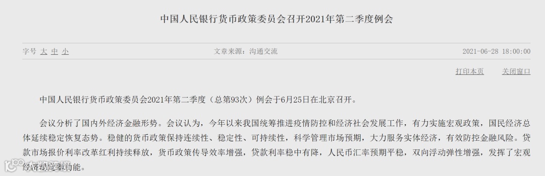 6月28日,央行网站消息,中国人民银行货币政策委员会2021年第二季度(总第93次)例会于6月25日在北京召开。