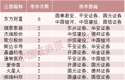 7月券商推荐次数较多个股还包括顾家家居、杰瑞股份、歌尔股份、斯达半导、晶盛机电、通策医疗等,所属申万行业包括电子、医药生物、电气设备等。爱帝宫作为港股上市公司7月也获得券商看好,资料显示公司主营业务包括月子服务等。