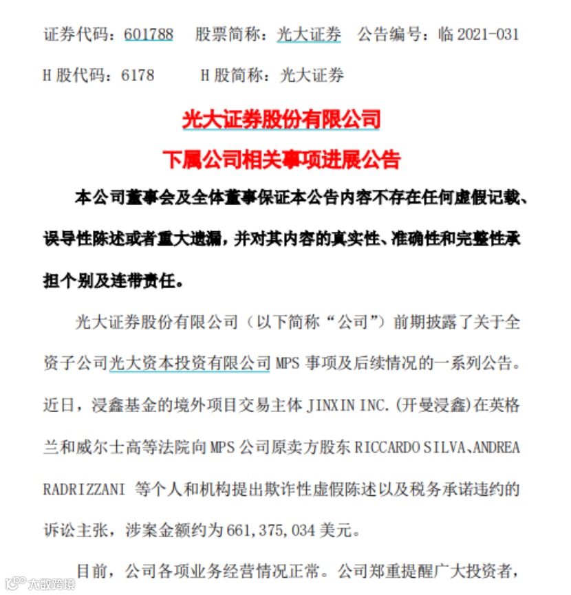 2020年4月,光大证券曾披露MPS案件一审判决结果,上海金融法院判决光大证券全资子公司光大资本向招商银行支付约31.16亿元及自2019年5月6日至实际清偿之日的利息损失,并承担部分诉讼费、财产保全费等费用;向华瑞银行支付投资本金4亿元,支付2018年1月1日至实际履行之日投资收益并承担诉讼费、保全费等。目前,光大资本已提起上诉,相关诉讼仍在履行司法程序中。