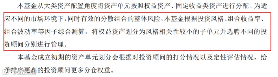 在投资顾问选择上,该基金表示会根据投资风格、组合收益率、组合波动率等因子综合测算,将权益资产划分为风格相关性较小的子单元,以此来选聘投资顾问。并且,在成立初期,该基金的资产单元划分,会根据对投资顾问的打分情况以及定性评估情况,给予排序更高的投资顾问更多分仓权重。