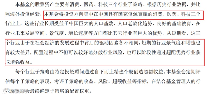 鹏华基金旗下的鹏华精选群英混合(MOM)的资产配置主要由股票和债券组成。其将严格根据不同资产之间的估值,来计算股票资产的风险溢价水平,并根据风险溢价具体的历史分位数以及当时的风险溢价水平的合理性,最终决定股票资产的投资比例。并且,该基金明确表示,其股票资产主要聚焦在消费、医药、科技三个行业上,并给出了策略依据。