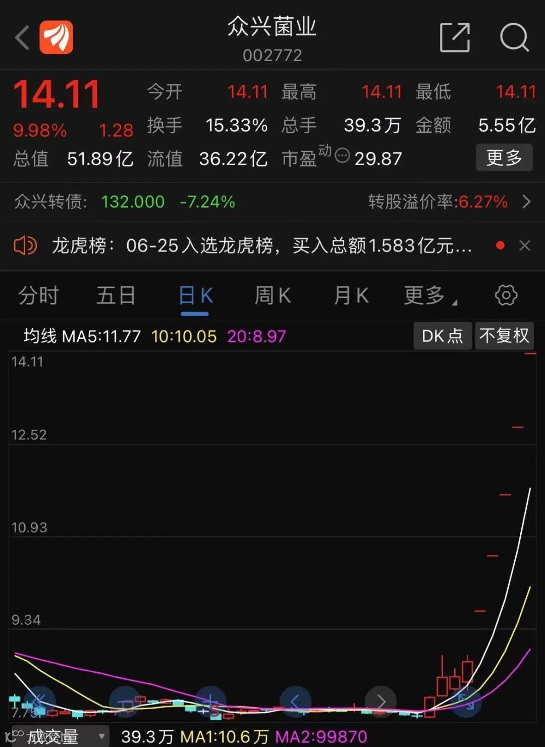 这则收购彻底点燃炒作热情,次日(6月21日)开盘公司股价集合竞价即一字涨停,封单超过200万手。随后更是连续4日涨停,截至周五收盘,众兴菌业收报14.11元/股,全天成交5.55亿元。