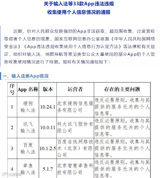 根据国家网信办5月1日消息,针对人民群众反映强烈的App非法获取、超范围收集、过度索权等侵害个人信息的现象,国家网信办对输入法、地图导航等常见类型公众大量使用的部分App的个人信息收集使用情况进行检测,发现搜狗输入法、讯飞输入法、百度输入法、QQ输入法等15款输入法应用违法违规收集使用个人信息,高德地图、百度地图、腾讯地图等17款地图导航类应用侵犯用户合法权益。按照要求,相关App运营者应于通报发布之日起10个工作日内完成整改,逾期未完成整改的将被处置。