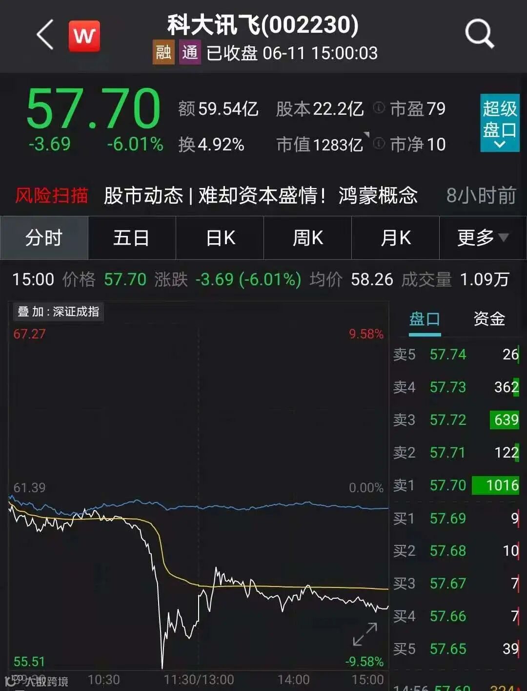 6月11日,科大讯飞股价盘中跳水,一度跌超9%,收盘跌6.01%,每股报57.7元,最新市值1283亿元。科大讯飞董秘江涛回应中国证券报记者称:公司各项经营正常。