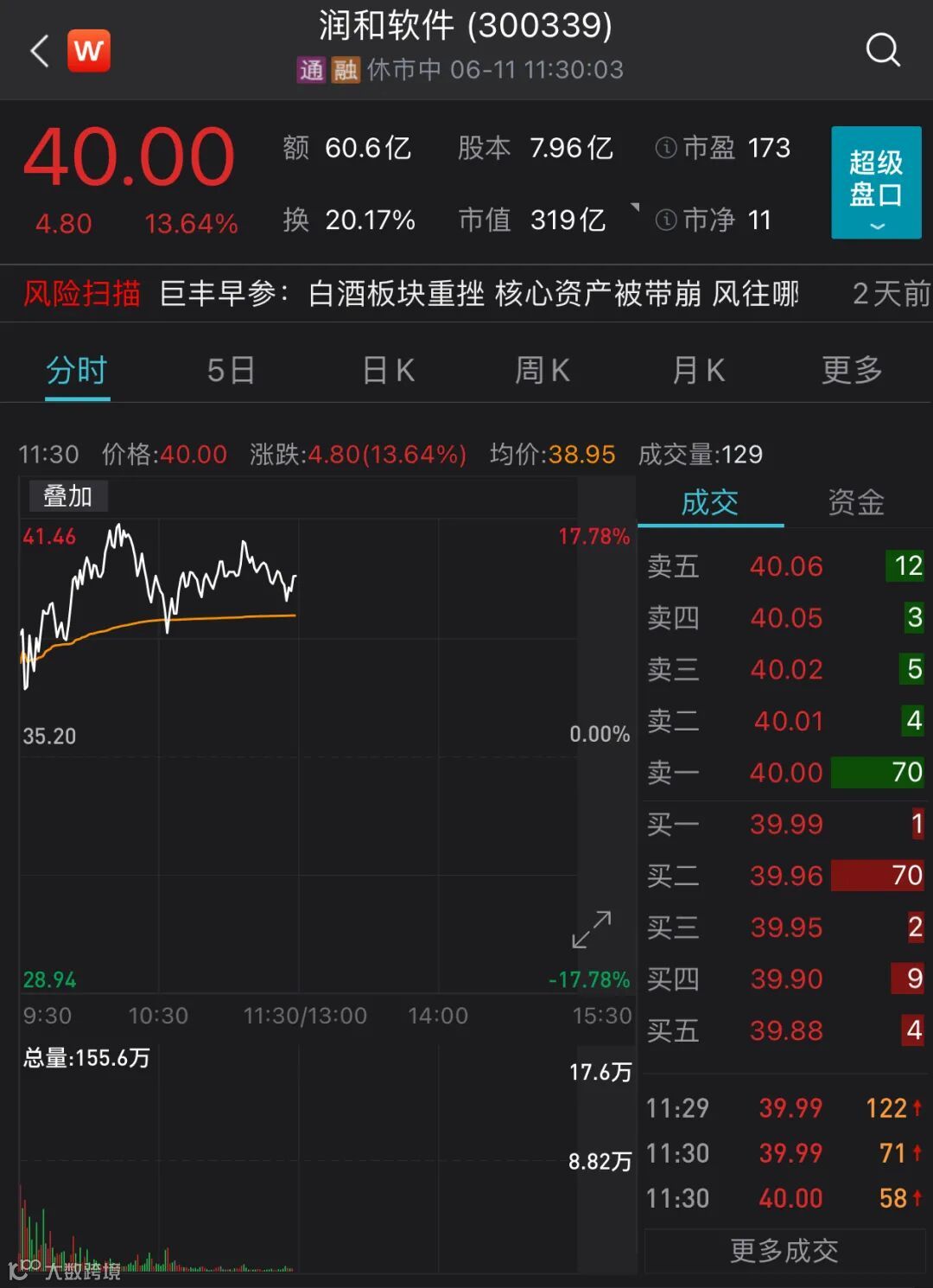 润和软件就是其中代表。Wind数据显示,自5月10日至6月10日,润和软件股价已经累计上涨将近302%。6月11日上午,其最新股价报40元,市值达319亿元。