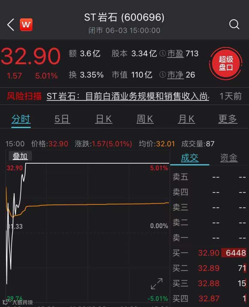 此外,ST板块炒作行情近期再度上演,在此前ST舍得(现为舍得酒业)成功摘帽的示范下,将白酒当做主营业务的ST岩石也吸引了资金的关注。