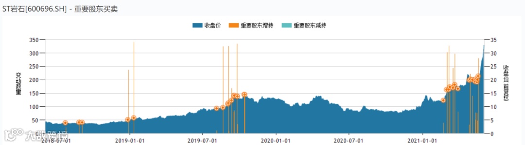 若把时间线拉长,5月13日以来,公司股价从18.23元/股上涨至目前的32.90元/股,涨幅80.47%;今年以来,ST岩石股价涨幅高达181.19%,总市值增长70亿元左右。