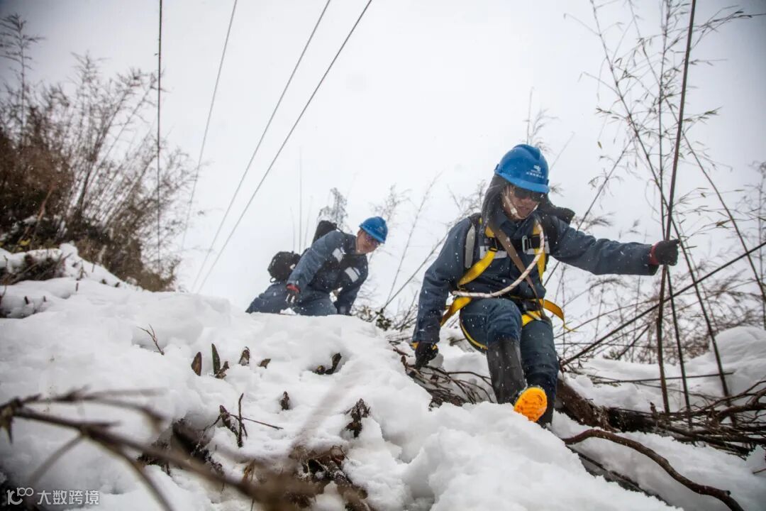 南方电网云南送变电工程公司独龙江乡35千伏联网工程施工人员踏着厚厚的积雪向山下返回