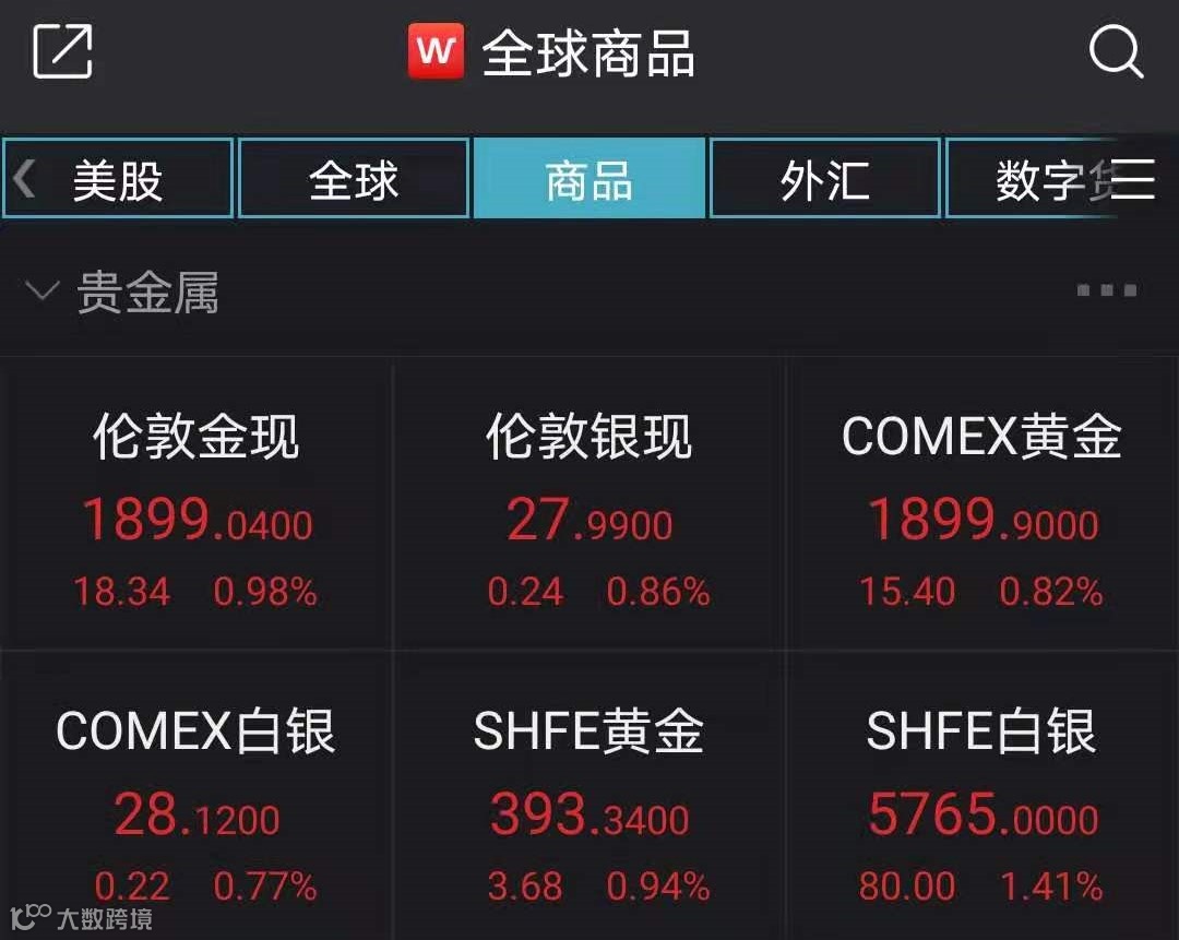 COMEX黄金期价隔夜持续走高,盘中一度站上1900美元/盎司,截至收盘涨幅略微收窄至0.82%,价格报1899.9美元/盎司,创下近5个月以来新高。隔夜黄金现货价格亦一度收复1900美元/盎司,截至收盘价格小幅回落至1899.04美元/盎司。