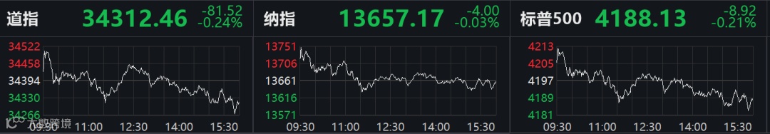 当地时间5月25日,美股三大股指小幅收跌。道指跌0.24%,报34312.46点;标普500指数跌0.21%,报4188.13点;纳指跌0.03%,报13657.17点。