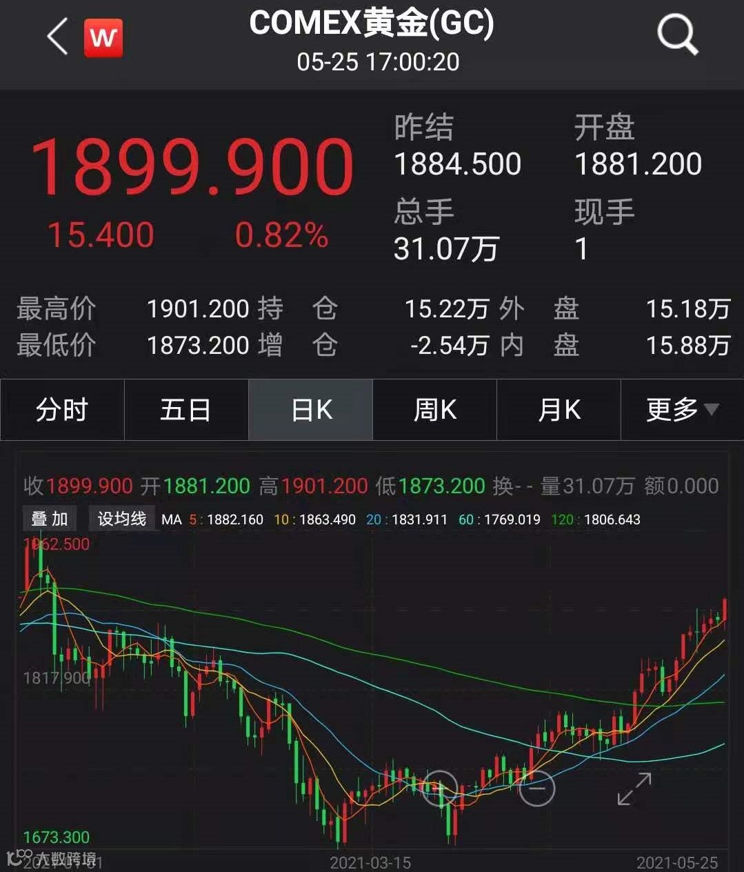 隔夜欧美股市整体表现较为平淡,但在通胀预期升温等因素推动下,国际金价进一步走高。Wind数据显示,截至当地时间5月25日收盘,COMEX黄金期价创下近5个月以来新高,并再度逼近1900美元/盎司的重要关口,黄金现货价格盘中亦一度站上1900美元/盎司。