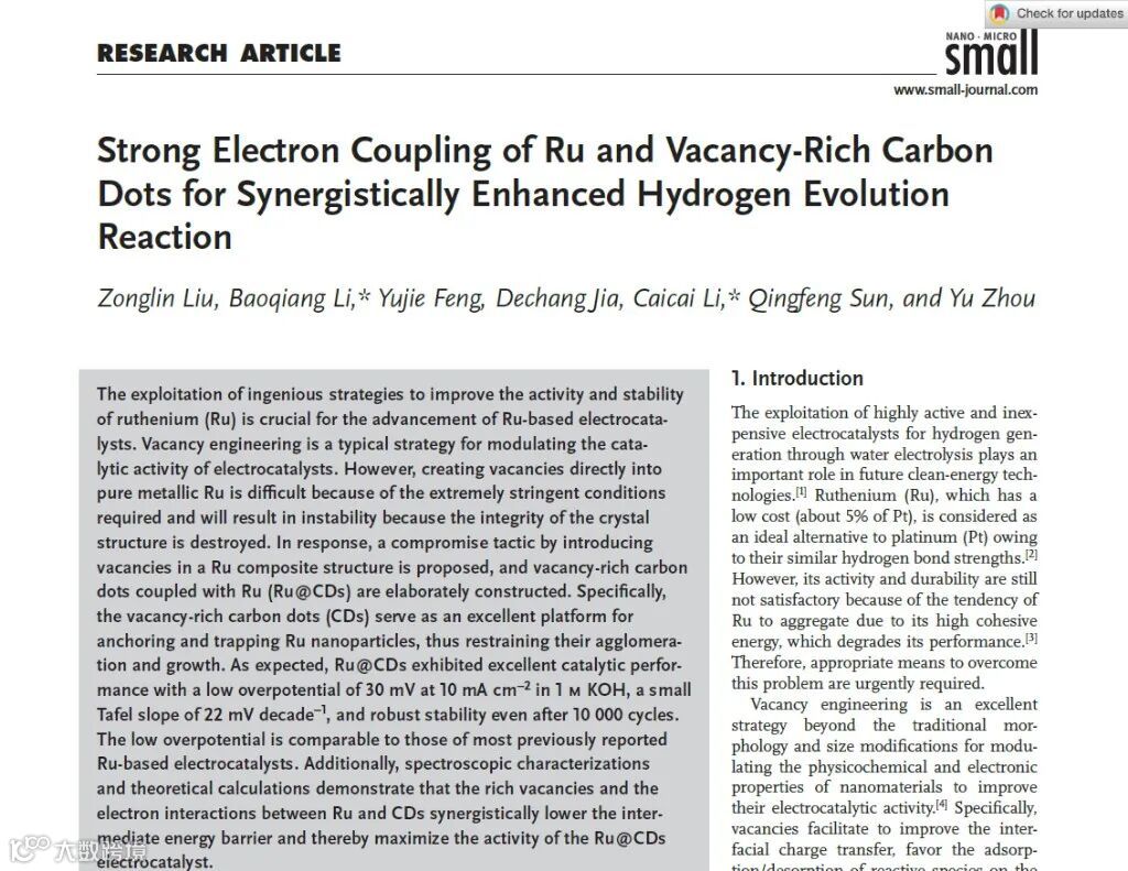 从哈尔滨工业大学获悉,该校材料科学与工程学院周玉院士团队李保强教授课题组与浙江农林大学孙庆丰教授、李彩彩副教授等人首次发现了将富含空位的碳点(CDs)与钌(Ru)结合构建钌/富空位碳点电催化剂(Ru@CDs),并揭示了强电子结合提高电催化析氢活性机制。该材料有效地拓宽碳点的应用范围,为面向氢气新能源的新型高效析氢电催化剂设计提供新思路。相关研究成果9月12日发表在材料领域重要学术期刊《小》(Small)杂志上。