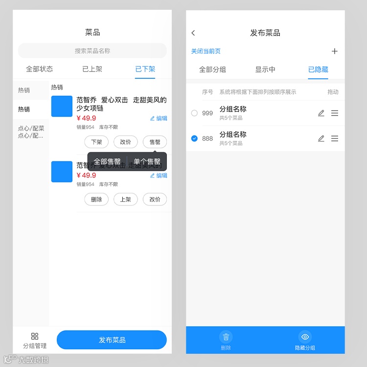 ·管理菜品、菜品分组。(添加、编辑、删除、售罄、排序)