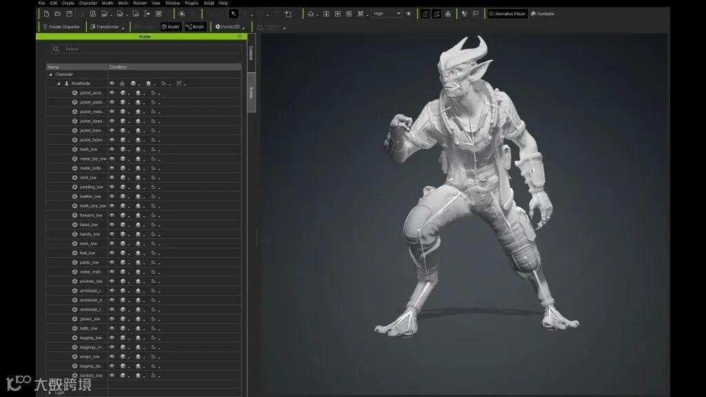 一旦我对姿势感到满意,我就从ZBrush导出整个模型并将其导入到Maya中,为每个UDIM分配唯一的材质,因为Marmoset Toolbag 4目前不支持UDIM。指定材质后,我将模型导出到Marmoset Toolbag 4进行照明和渲染。