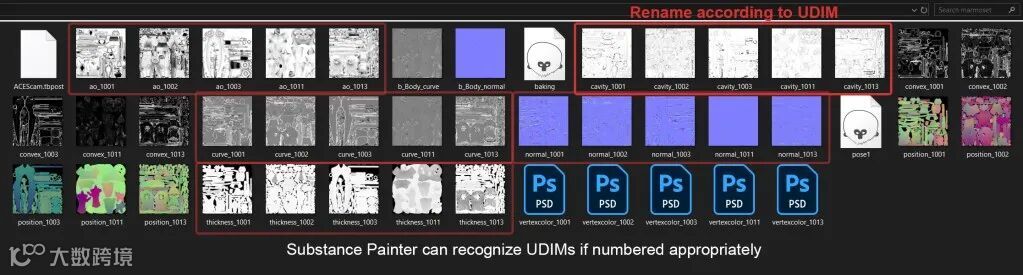 我使用了Marmoset Toolbag 4进行烘焙,因为它允许我手动绘制偏移并倾斜烘焙笼以消除烘焙错误。更繁琐的步骤是手动将所有烘焙贴图重命名为其对应的UDIMs,以便Substance Painter可以正确识别它们。
