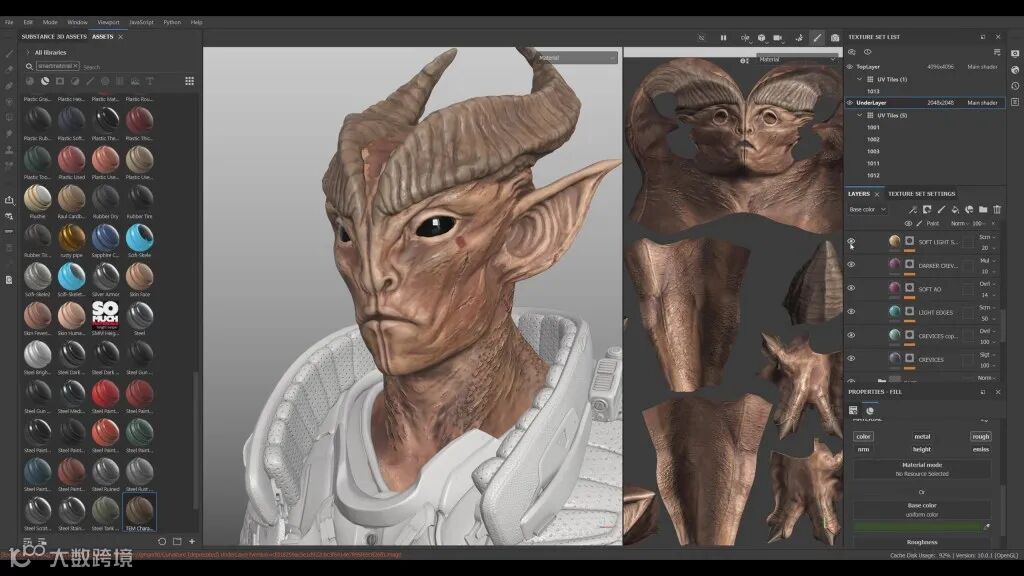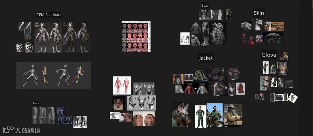 在这之后,我将模型和烘焙贴图导出到Substance Painter中,开始了PBR纹理工作流程。为了实现逼真的外观,我参考了现实生活中的衣服和生物皮肤来复制复杂的细节,如衣服上的污垢和皮肤上的皱纹和疤痕。