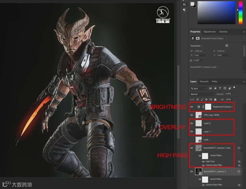 之后,我将原始渲染导入Photoshop,应用高通滤镜,并使用叠加来照亮关键区域,如人物的脸。这些调整有助于使您的作品在其他角色艺术家作品中脱颖而出。