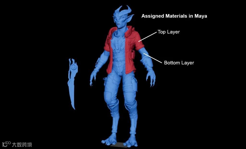 为了简化纹理阶段,我给角色分配了两种材质:一种用于夹克,一种用于角色的其余部分。这让我可以隐藏外套层,并适当地纹理下面的材料。