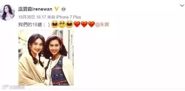 10月底温碧霞晒出一张与朱茵的旧照,并发文称:我们的十八岁,引发网友集体惊叹“岁月婆娑,美人依旧”。