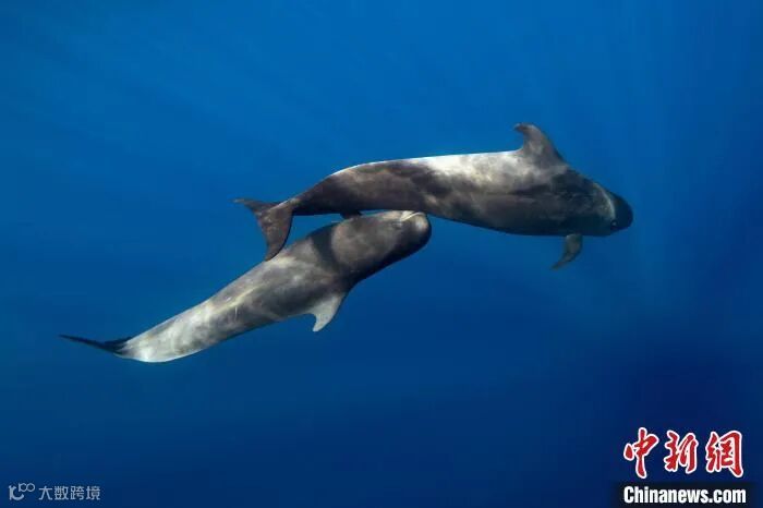 特内里费岛海域一个短肢领航鲸母亲育幼的水下照片(图片来自Francis Perez)。施普林格·自然 供图