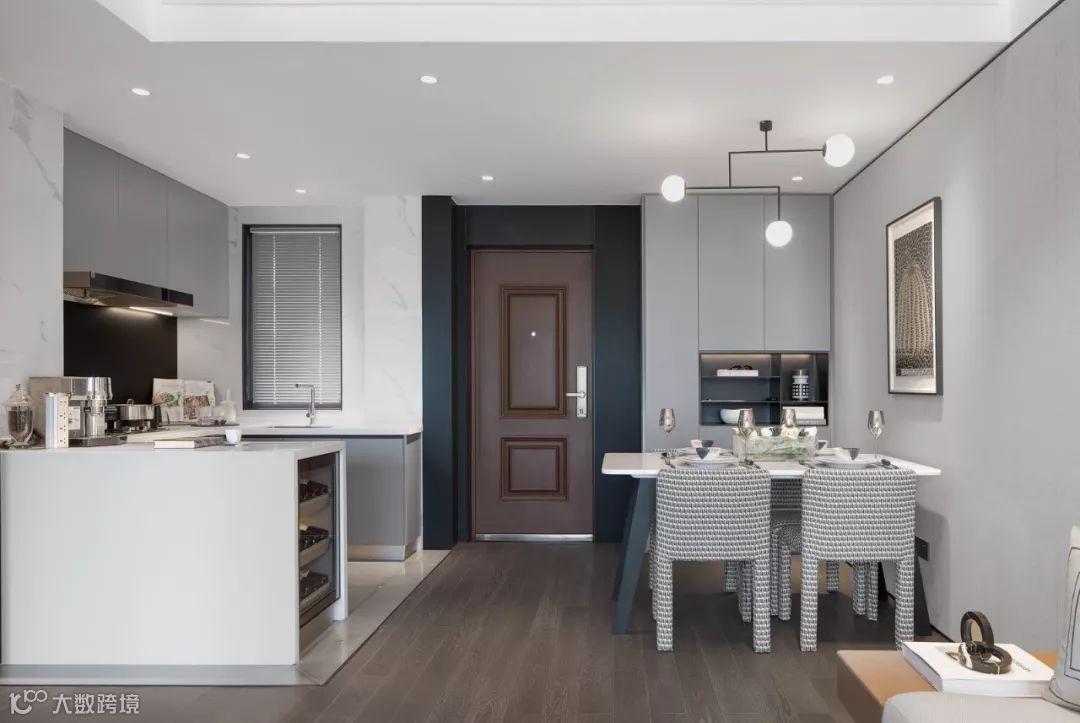 进门右侧是厨房,左侧是餐厅,采用开放式的设计,缓解入户的压抑与空间的局促感。
