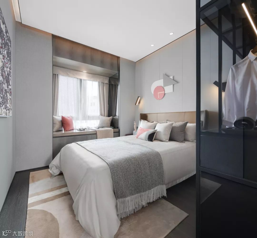 主卧以浅灰色为主色调,通过深色地板和衣柜来实现空间轻与重的平衡。黑色玻璃衣柜,增加了空间的通透感,又避免了凌乱的视觉感。