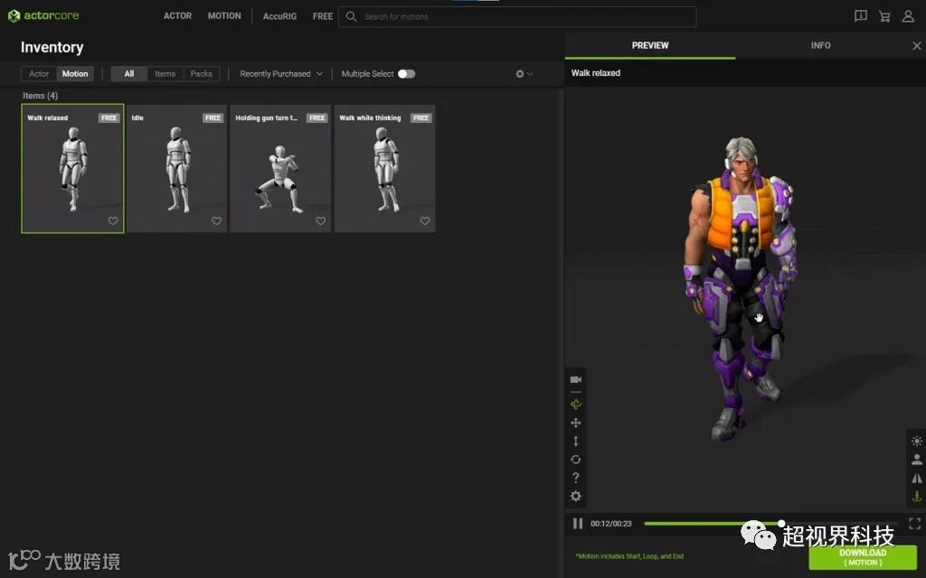 在示例案例中,只需单击一个按钮即可将角色直接发送到ActorCore,并且它已准备好重新定位各种动作捕捉动画中的任何一个。从那时起,选择行走动画并将其导出以使用适当的照明和材料在Sketchfab中使用变得非常快速和容易。