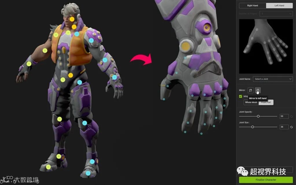 在此示例中,角色具有相当好的拓扑结构,并且处于A Pose. 导入并确保它与中心对齐后不久,将创建绑定,然后每个骨骼的位置通过半透明圆圈显示在模型顶部,您可以调整大小和不透明度。可以用鼠标拖动它们来调整位置并激活对称以同时移动两侧。该工具甚至具有放置辅助选项以加快该过程,并在屏幕右上角有一个非常方便的参考框,用于选择哪个骨骼以及应该正确放置在身体上的哪个位置。一旦您对整个身体骨架感到满意,下一步就是放置手的手指骨骼以提高精度。这一步尤其是对其他可用工具的巨大改进,并且避免了通常的“柔软”和奇怪的弯曲手指。