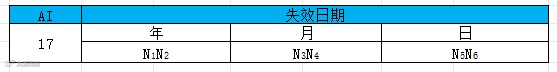 失效日期:AI(17):决定一个产品消费或使用的最终限定日期,可由 GS1 应用标识符“17”编制,单元数据串格式见下表。失效日期应与贸易项目的 GTIN 一起使用。