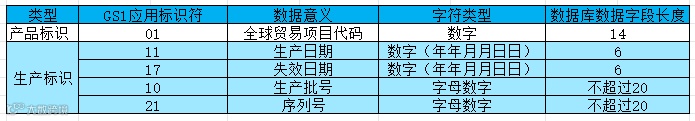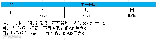 生产日期:AI(11):生产、加工或组装的日期,由制造商确定,可通过 GS1 应用标识符“11”编制,单元数据串格式见下表。生产日期应与贸易项目的 GTIN 一起使用。