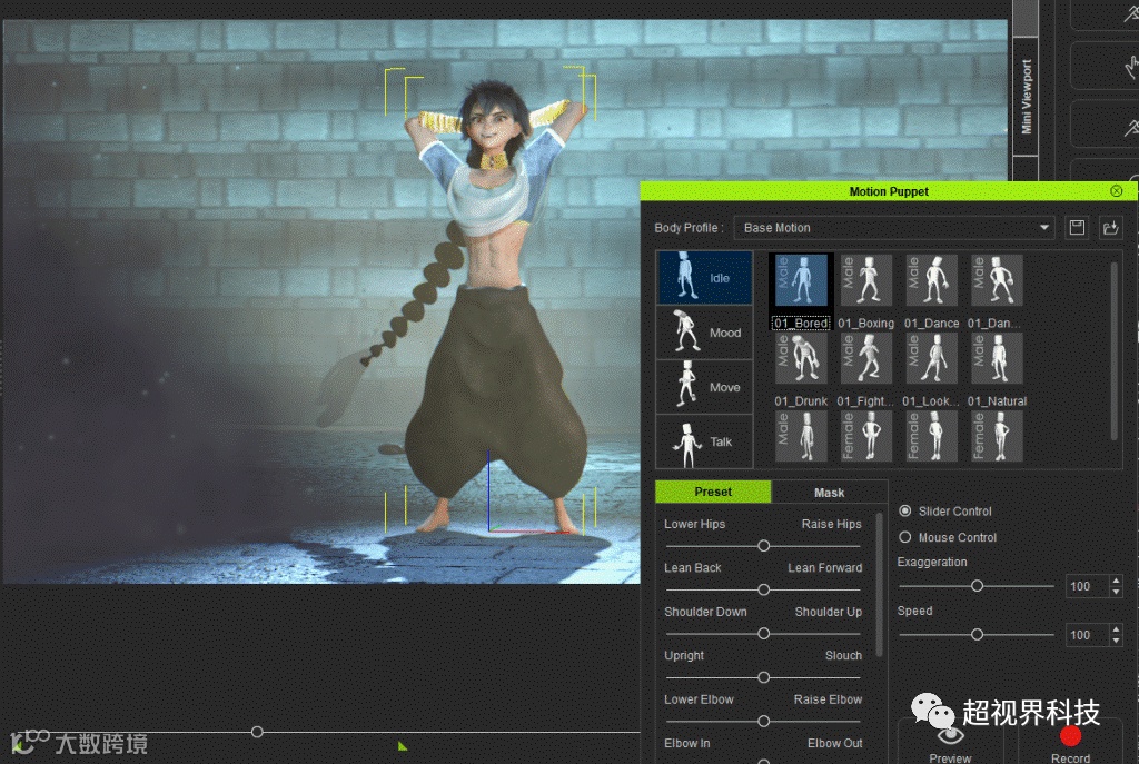 我挑选的3D场景几乎没有角色动画。尽管如此,我还是利用Motion Puppet工具创造了一些简单的动作,以此避免了角色一直像雕像一样呆在原地。例如,在第一个序列中,我将他的手放在他的头上,并使用Motion Puppet的“Bored”选项只记录了他下半身的运动。它非常容易定制话且有可能是iClone中最好的功能之一。