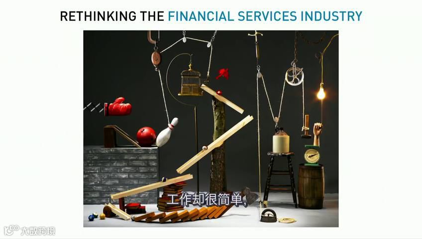 所以为了理解即将到来的突破性的改变,让我们看一个行业:金融服务业。你是否能认出这是什么?小题大做的机器。这台机器离奇的复杂,工作却很简单,就像敲碎鸡蛋或是关上门等。老实说,它使我想起了金融服务业,我的意思是,你在街角的商店刷了卡,一股比特流便穿过了好几家公司,每一家都有自己的计算机系统,其中还有一些是20世纪70年代的主机,甚至比在座的各位还要老,然后三天过后,清算才发生。好吧,金融业有了区块链,将不再会有清算,因为交易和清算是同一种行为,它只是改变账本。所以在华尔街或世界上所有的地方,金融业正在巨变,思考着自己是否会被取代,或是如何正视技术迎接成功?