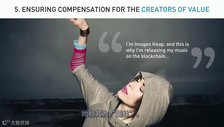 第五点:有许多内容的创造者并没有得到公平的报酬,因为知识产权系统遭到了损害,在互联网的第一个时代就遭到损害。就拿音乐来说,音乐家们只在食物链的末端获得一些残渣碎屑。在25年前,如果你是一个作曲家,写出一首流行的歌曲,卖出一百万首单曲,你可以获得大约45000美元的报酬。而现在,作曲家的你写出一首流行的歌曲,被百万次播放,你并不能得到45000美元,你只能得到36美元,足以买一个不错的披萨了。所以伊莫金·希普一位荣获格莱美奖的创作歌手,现在把音乐发表在一个区块链的生态系统上,她称其为“菌丝”,其中的音乐有着智能协议,音乐保护着她的知识产权,你想要听歌吗?它是免费的,或者会有几分钱流入数字账户,如果想要在电影中使用这首歌,那就是另外价格,知识产权都有详细的说明。你想作为手机铃声?那也是另外一个价格。她描述到,歌曲成为了商业,在这个平台上歌曲实现了商业化,保护了作者的权利。并且因为歌曲采用了一种类似于银行账户的支付系统,所有的钱都会到艺术家的手中,他们掌控了行业,而不是由那些强大的中间商所控制。现在,不仅仅是歌曲作家,任何形式的创作活动,比如美术、发明、科学发现、新闻记者各行各业没有得到公平报酬的人,而有了区块链,他们将在区块链上得到巨大收益,那样可真棒。