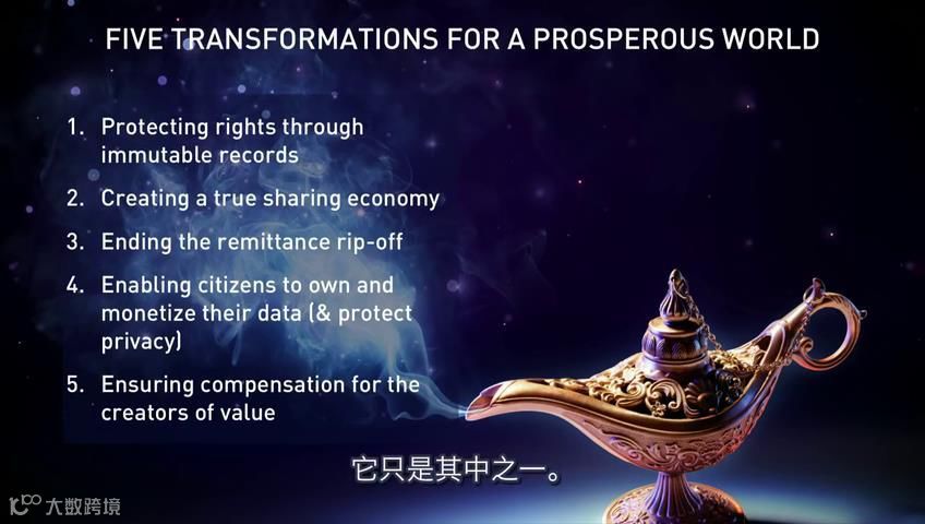 这是十几种机遇中的5种,来解决一个问题:繁荣。区块链可以应用于无数问题,它只是其中之一。当然,科技不创造繁荣,而是由人创造。但是我只是再次表示,科技的精灵已从瓶中逃出,受到一位或几位不知名人士的召唤,在人类历史上这个不确定的阶段,它给了我们一次尝试,另一个改写经济权利网络和旧秩序的机会,并且只要我们愿意,可以解决一些世界上最麻烦的问题。