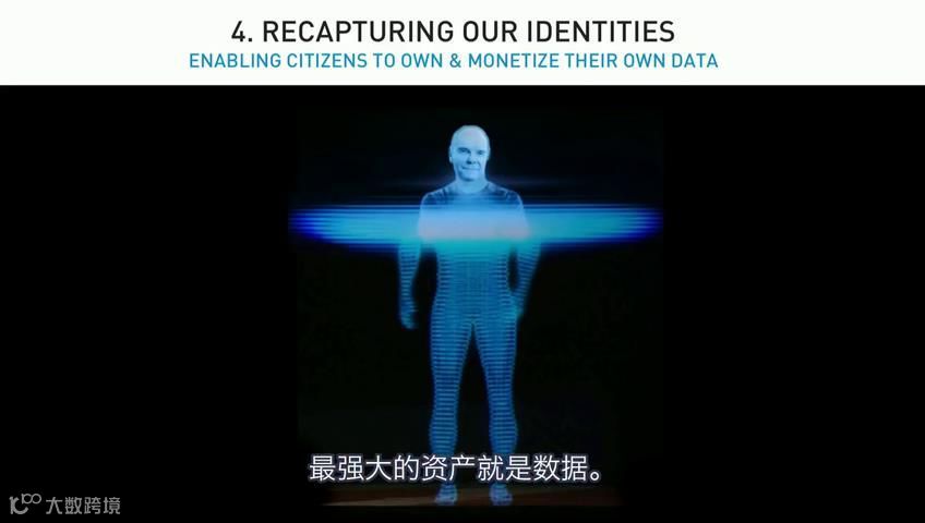 第四点:数字时代最强大的资产就是数据。数据是一种新的资产种类,也许比以前的资产种类更庞大,就像农业经济下的土地,或是工厂,甚至是金钱。是我们所有人,创造了这些数据,我们创造了这种资产,在我们的数字生活中,留下了零碎的痕迹,这些痕迹汇聚成了你的镜像,一个虚拟的你。虚拟的你也许比你还要了解你,因为你并不一定记得一年前买了什么,或是说了什么,或者你一年前的准确位置。而虚拟的你并不属于你,那可是个大问题。所以现在有许多公司致力于开发一个黑盒中的身份系统,属于你自己的虚拟的你。这个黑盒会随着你移动,前往世界的每一个角落,它对你的隐私守口如瓶,它只会根据需要透露一丁点的信息。有许多的交易,卖家甚至不需要知道你是谁,他们只要知道能拿到钱,于是这化身清除了所有数据,使你能够进行货币化,这可真棒,因为它能保护我们的隐私,而隐私是自由社会的基础。让我们重新夺回我们创造的这一资产的控制权,我们拥有我们自己的身份并进行负责的管理。