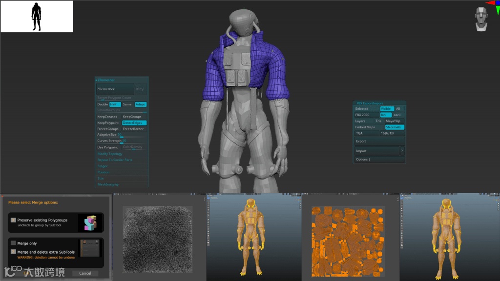 在将所有子工具组合或合并为更易于管理的子工具之前,请重新网格化它们。在组合子工具时,请记住项目的纹理大小限制。如果你有一个非常高的多边形模型,需要许多子工具来保持子工具多边形倒计时并导出为单个FBX,你总是可以在Blender等程序中组合uv并重新导入,为你的模型提供新的/更新的uv贴图。