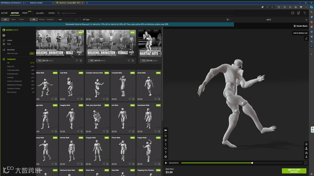 ActorCore中的导航已经为用户进行了简化,搜索栏有一个巨大的单词列表,它可以识别,通用导航条的左侧有一个扩展列表,可以容纳网站上的所有动画。在此过程中,如果您发现了感兴趣的动画,您可以随时通过单击预览图像上的心形图标来收藏它,以便以后再次访问。浏览完网站后,选择你的动画并双击它。它将出现在3D预览窗口中的角色上。点击购买按钮,并通过下一个屏幕,使动画下载,并永久访问它。