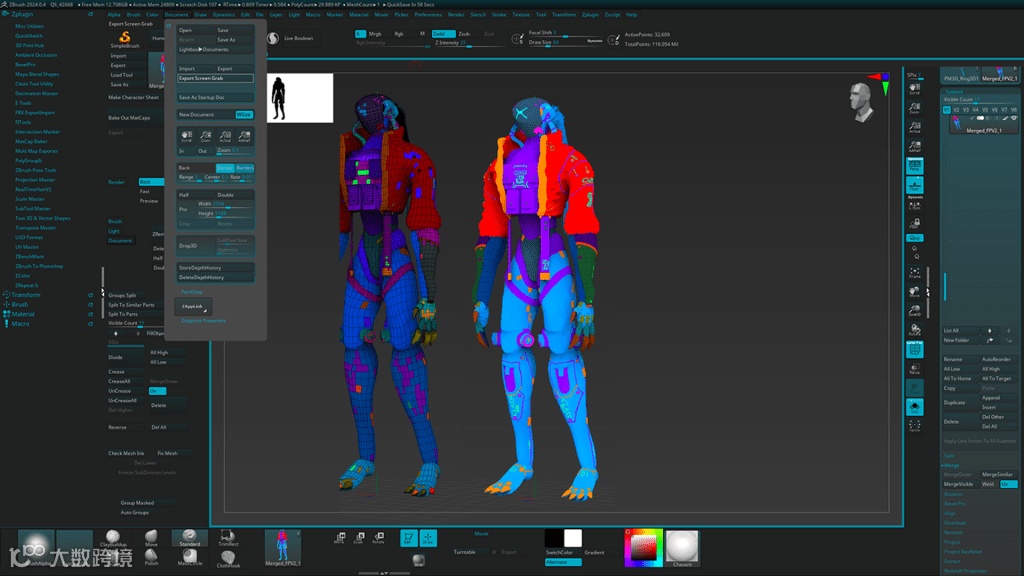 在雕刻细节时,打开MatCap color painting进行雕刻对于稍后的纹理生成的材质ID贴图至关重要。对于模型的每个部分,您应该使用不同的MatCap。最后,让所有的垫子都是平的,没有一个是相同的颜色。使用ZBrush附带的UVMaster插件,并在插件中启用多边形组。