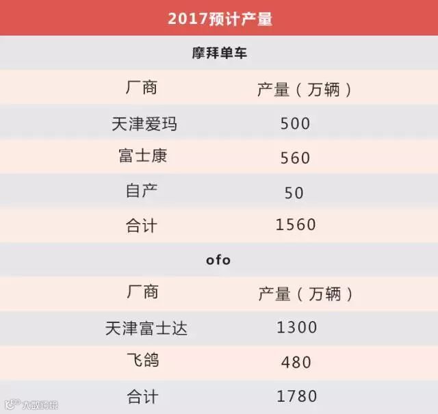 但是摩拜和ofo在2017年预计投放总量将出现“井喷”式爆发,据腾讯科技综合对应供应商产能来看,摩拜和ofo在今年的投放量可以达到3000万辆。