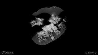 拍摄难度最大、时间最长的是「结晶」过程。结晶速度的快慢非常难以控制,快则来不及开镜头、慢则需要等上几小时。但难度越高收获越大:这是氯化钠结晶,就问你美不美?