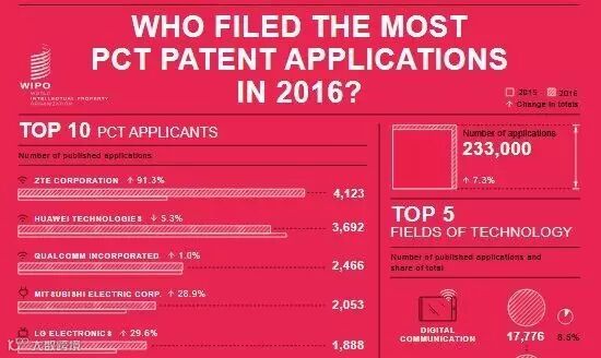 最明显的表现就是,近些年来,中兴、华为多次成为全球国际专利申请数量最多的企业:去年夺冠的中兴早在2011年与2012年已是PCT申请量最多的公司;而华为也是2014年与2015年的PCT申请冠军。