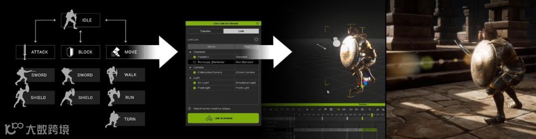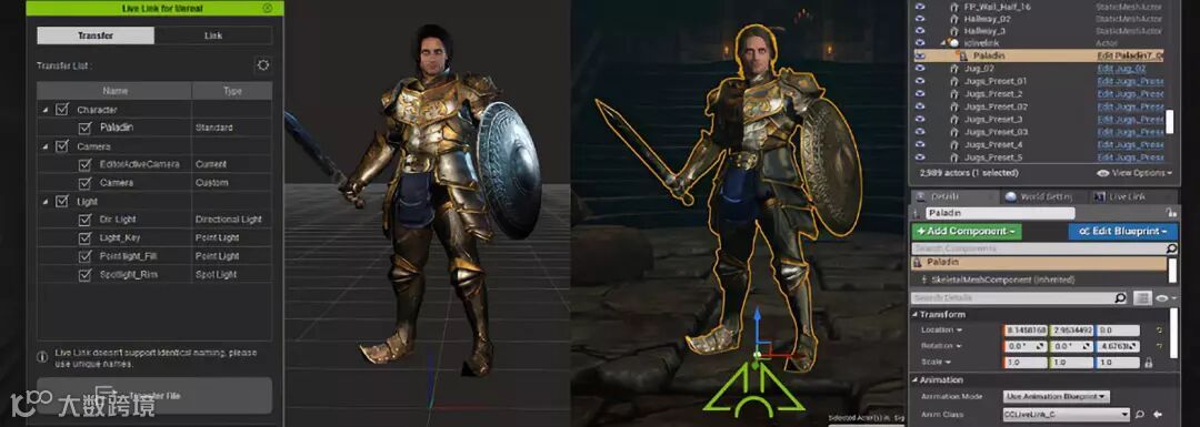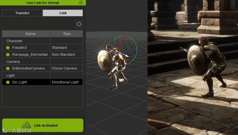 除了可以控制从iClone传输来的资产外,用户还可以通过 Live Link Blueprint将Unreal Engine中创建的摄像机、灯光甚至角色(链接的角色应具有相同的骨骼结构并使用相同的名称)链接到iClone。Unreal Engine的角色也可以通过3DXchange发送到iClone,为其共享Unreal角色的所有动作设计。